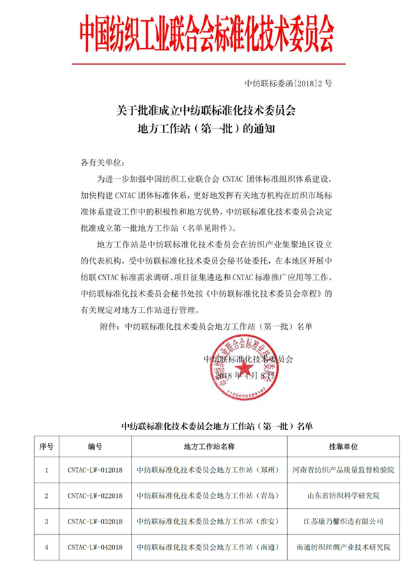 2018年4月8日,中纺联标准化技术委员会公布了首批地方工作站名单,华体会·官方版网站登录入口等四家单位成功获批。