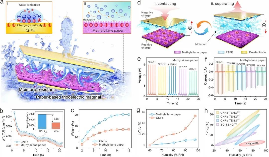 通过水蒸气透过率实验和湿重检测推测,该纤维素摩擦电材料上的疏水甲基是抵抗湿空气干扰的关键。结合高湿度环境下的自供电性能检测,发现所制备的纤维素摩擦电材料较传统材料抗湿性能提升了4倍。
