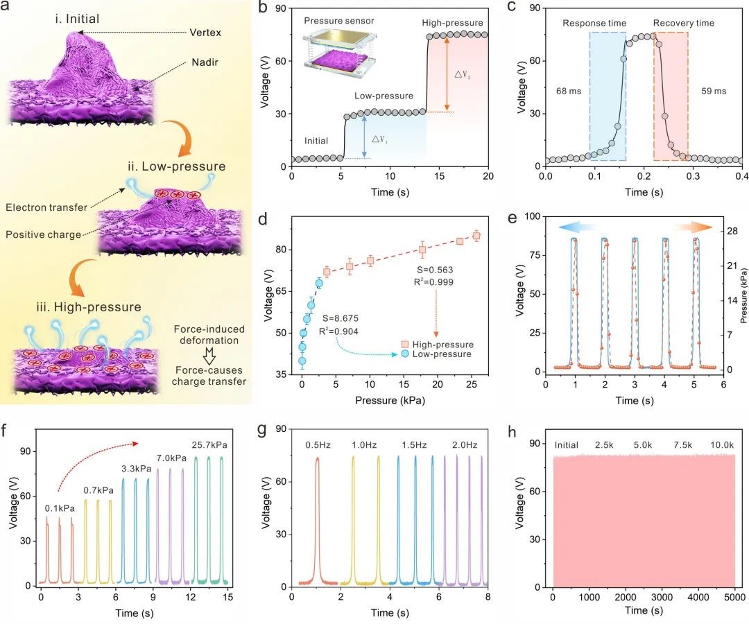 通过应力传感性能检测发现,微山峰在应力压缩过程产生形变,从而具备优异的应力响应性,对传感性能的贡献很大,而且纤维素摩擦电材料具有出色的传感稳定性。